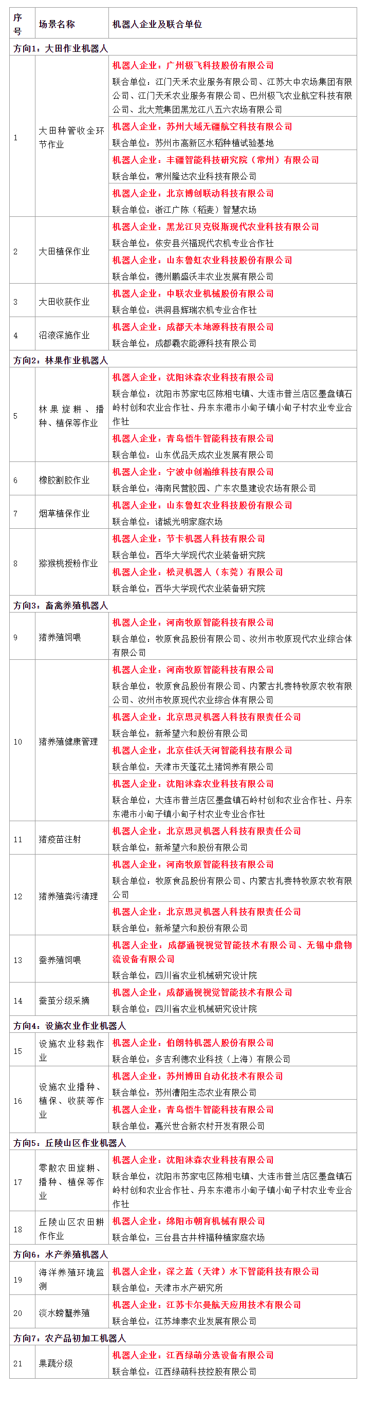 從公示名單中可以看出,農業領域機器人應用優秀場景有大田作業機器人、林果業作業機器人、畜禽養殖機器人、設施農業作業機器人、丘陵山區作業機器人、水產養殖機器人、農產品初加工機器人7個方向。