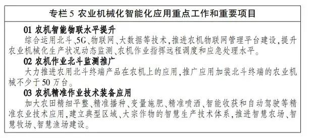 二是示范運用智能化技術。積極引導高端智能農機裝備投入農業生產,加快提升農機裝備“耕、種、管、收”全程作業質量與作業效率。大力推廣基于北斗、5G的自動駕駛、遠程監控、智能控制等技術在大型拖拉機、聯合收割機、水稻插秧機等機具上的應用,引導高端智能農機裝備加快發展。加快播種、施肥施藥、收獲等環節智能裝備的廣泛應用,推動設施園藝、畜禽水產養殖、農產品初加工的機械化、自動化、智能化裝備應用。