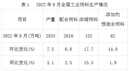 近日,中國飼料工業協會發布《2022年9月份全國飼料生產形勢》。據樣本企業數據測算,2022年9月,全國工業飼料產量2833萬噸,環比增長7.5%,同比增長3.1%。而在此前單月同比數據均為下降,9月環比增長率也創下年內新高。