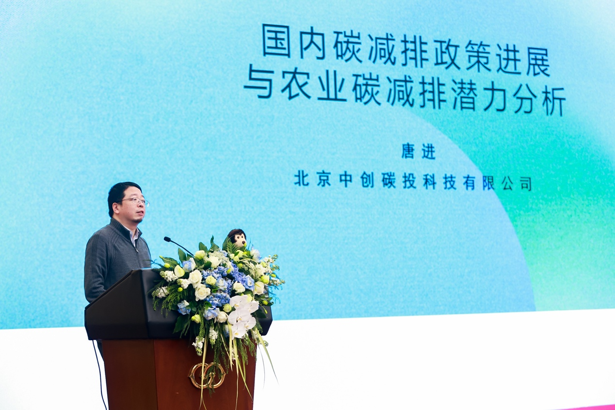 北京中創(chuàng)碳投科技有限公司研究院院長、高級工程師唐進帶來了題為《國內(nèi)碳減排政策進展與農(nóng)業(yè)碳減排潛力分析》的發(fā)言。他介紹了國內(nèi)的碳減排政策和碳市場的基本類型,中國自愿減排機制(CCER)發(fā)展歷程、交易現(xiàn)狀和交易行情等,并對農(nóng)業(yè)碳減排潛力進行了具體分析,把其技術(shù)路徑分為能源替代、固碳、非二氧化碳減排三種,對每一種路徑都做了詳細闡述。