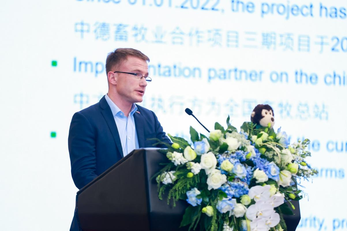 中德畜牧業(yè)合作項目德方項目組組長Henrik Delfs進行了題為《再生畜牧業(yè)在德國的發(fā)展以及畜牧業(yè)轉(zhuǎn)型進展》的發(fā)言。他介紹了中德畜牧業(yè)可持續(xù)發(fā)展合作項目,以及德方項目參與企業(yè)的創(chuàng)新和技術(shù);對德國動物福利現(xiàn)狀進行了闡述,如豬業(yè)生產(chǎn)中自2021年起全面禁止使用限位欄,牛和犢牛飼養(yǎng)中從2024年起禁止針對6月齡以內(nèi)的犢牛使用混凝土漏縫地板,以及到2033年停止拴養(yǎng)等。