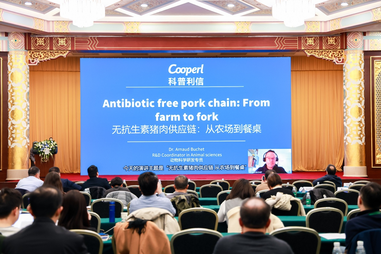 會議的第四個議題為“無抗生素畜產(chǎn)品生產(chǎn)及養(yǎng)殖技術(shù)”。來自科普利信的Dr.Armaud BUCHET以視頻的形式分享了他的演講:《無抗豬肉產(chǎn)品:從農(nóng)場到餐桌》。針對目前畜牧業(yè)中抗生素的使用情況,他指出,選擇合適的農(nóng)場進行無抗生素生產(chǎn)至關(guān)重要。要做到“無抗生素生產(chǎn)”,就要采取相應(yīng)有力措施,如對接受過治療的動物進行分類、確保其可追溯性,激勵農(nóng)戶申報治療情況,對所有豬(無論是否接受過治療)給予更多收益等。