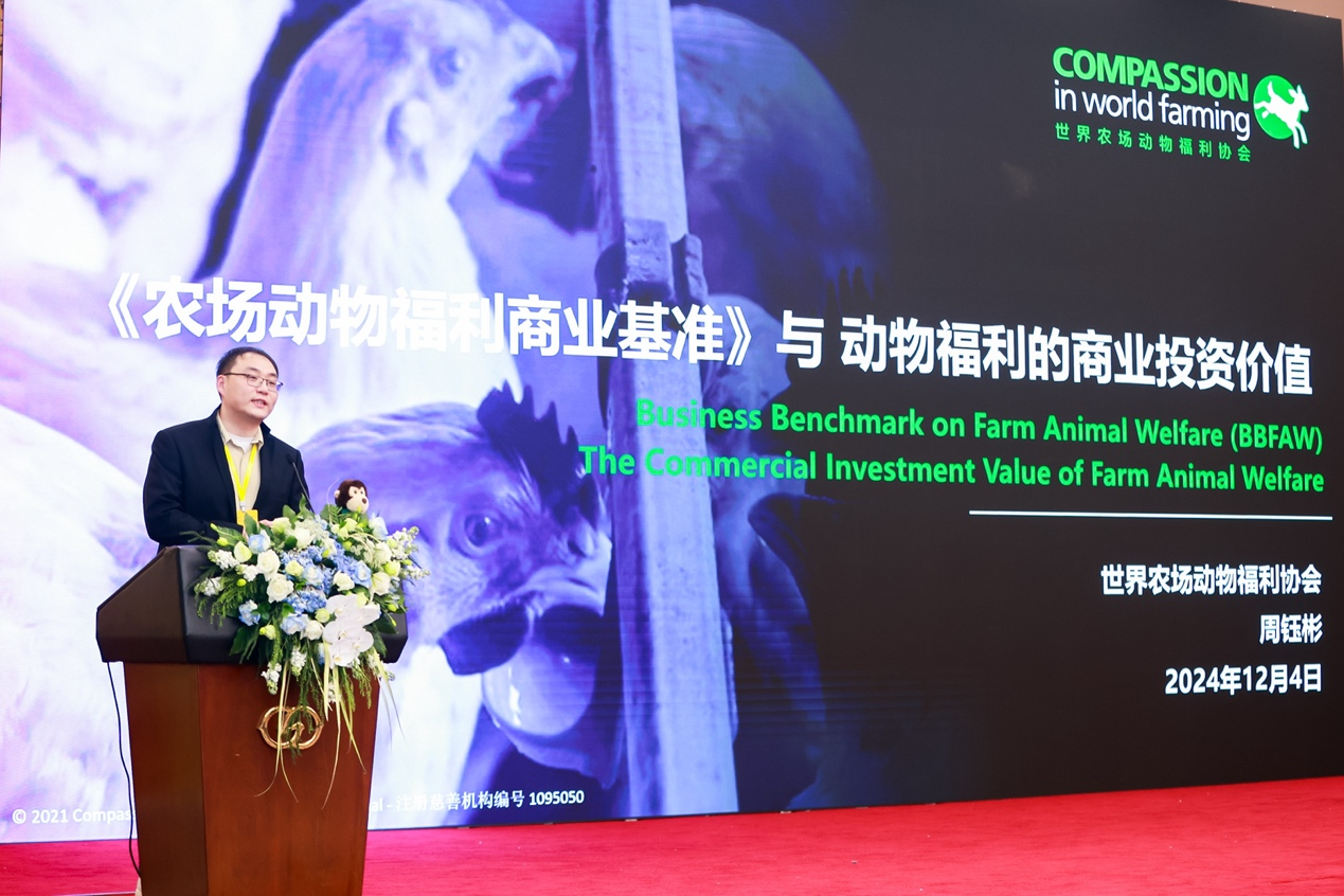 世界農(nóng)場動物福利協(xié)會食品行業(yè)經(jīng)理周鈺彬做了有關(guān)“《農(nóng)場動物福利商業(yè)基準(zhǔn)》動物福利的商業(yè)投資價值”的分享。他先是詳細介紹了世界農(nóng)場動物福利協(xié)會的工作范疇及積極影響,并對《世界農(nóng)場動物福利行業(yè)基準(zhǔn)》(BBFAW---Business Benchmark on Farm Animal Welfare)中農(nóng)場動物福利管理、政策承諾和績效披露的全球領(lǐng)先指標(biāo)進行了解讀,指出其直接或間接地推動了農(nóng)場動物的福利。“我們不應(yīng)該把養(yǎng)殖動物當(dāng)作機器來對待,它們應(yīng)該享受正常的生活并可以表達自然天性。保護傳統(tǒng)(更自然的)養(yǎng)殖方式,也是在保護我們的飲食文化。”