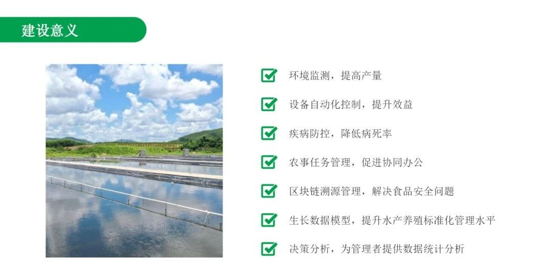 該方案通過物聯(lián)網(wǎng)、大數(shù)據(jù)、云計算等技術(shù),實現(xiàn)對養(yǎng)殖環(huán)境、水質(zhì)、水產(chǎn)品生長狀況等全方位監(jiān)測管理,提升水產(chǎn)養(yǎng)殖的精準性、科學性和管理效率。