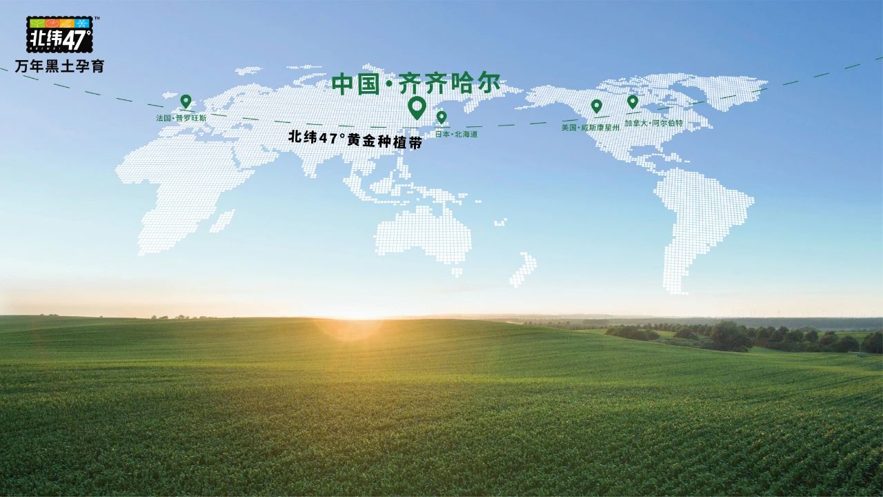 資料顯示,北緯47度,是世界公認的農產品黃金種植帶、黑土地核心地帶。在北美,北緯47度橫穿世界著名的優質小麥主產區。在日本,旅游勝地和農業重地——北海道也位于北緯47度。中國境內的北緯47度,位于東北黑土地核心區,坐擁僅占全球0.1%的萬年黑土地,這里流淌著無污染的嫩江水,土地自然休眠,天然沉淀更多營養,孕育出我國黃金玉米帶和優質乳源帶。