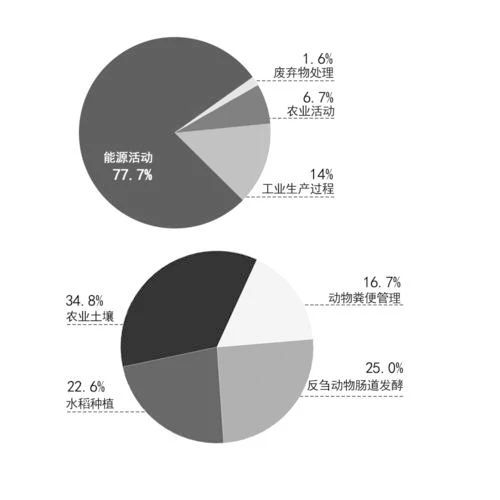 當前國內農業碳排放最新數據是2018年生態環境部提交的《中華人民共和國氣候變化第二次兩年更新報告》,報告顯示2014年我國碳排放總量約為123億噸二氧化碳當量(CO2e),農業活動碳排放總量為8.3億噸CO2e,占全國碳排放總量的6.7%。主要來源于動物腸道發酵、動物糞便管理、水稻種植、農業土壤和農業廢棄物田間焚燒。從產業領域看,種植業排放占58.4%;養殖業排放占41.6%;從氣體組成看,甲烷排放占農業總排放的56.2%,氧化亞氮排放占農業總排放的43.8%。本文研究數據均不包含土地利用變化和林業吸收碳匯數據。