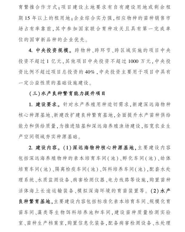 (三)水產良種繁育能力提升項目,中央財政支持:1000-4000萬;