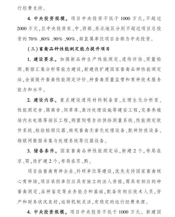 (三)畜禽品種性能測定能力提升項目,中央財政支持:1000-1500萬;