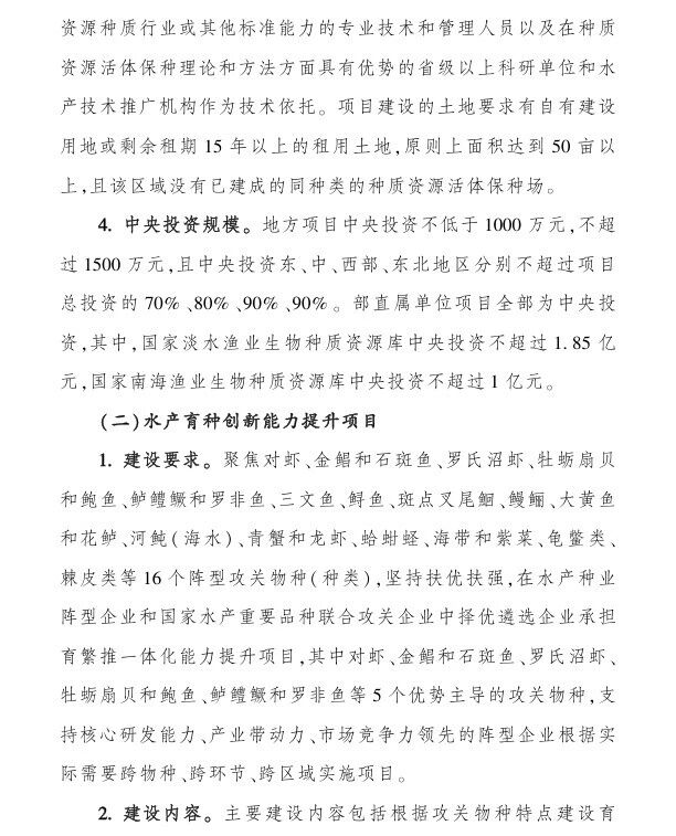 (二)水產育種創新能力提升項目,中央財政支持:1000-1億;