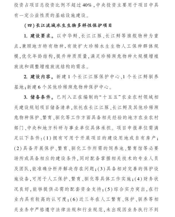 (四)長江流域水生生物多樣性保護項目,中央財政支持:不超過1億;