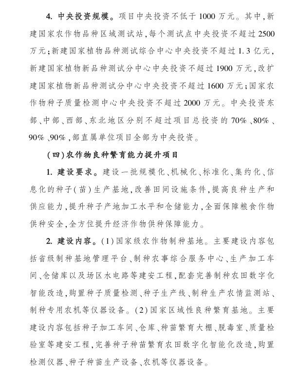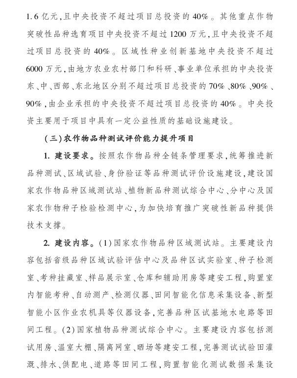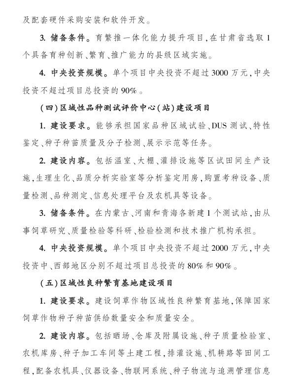 (四)區域性品種測試評價中心(站)建設項目,中央財政支持:不超過2000萬元;