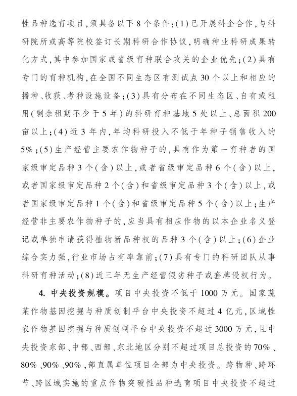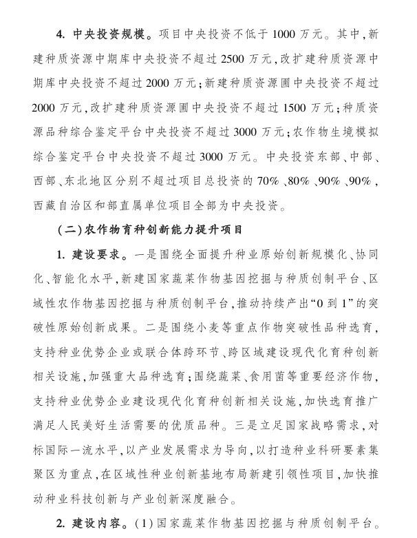 (二)農作物育種創新能力提升項目;中央財政支持:1000-6000萬;