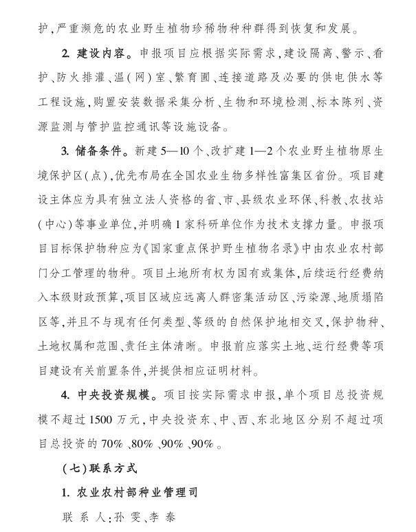 (六)農業野生植物原生境保護區(點)項目,中央財政支持:不超過1500萬;