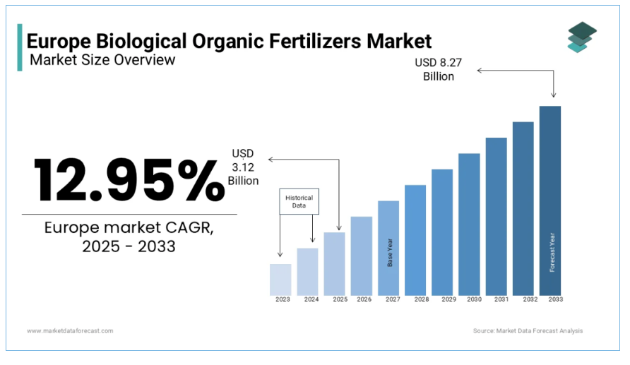 2024年,歐洲生物有機肥料市場估值約27.7億美元。根據相關預測,到2025年,該市場規模將增長至31.2億美元,并將以12.95%的年均復合增長率持續擴張,預計到2033年突破82.7億美元大關。