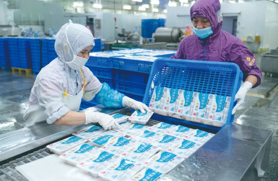 在一些沿海地區,藍色海洋成了預制菜強有力的供給來源。來到湛江市霞山區特呈島,《小康》記者看到當地漁民正在海面網箱旁喂魚。特呈養殖基地是我國最早一批深水網箱產業園示范基地。主營水產養殖、食品加工、智慧漁業的恒興集團經過公司、村委會、村民三方磋商,走出了“公司+基地+農戶+標準+服務”合作共贏的發展模式。通過發展預制菜產業,這種共贏模式得到強化,成功帶動當地村民500余戶實現增收,與當地村民共享產業發展成果。通過這種合作模式,農戶戶均增收上萬元,合作社一年還有幾十萬元分紅,這筆錢可作為村集體收入用于民生工程,實現了公司、農戶、村集體三方共贏?!斑@里養殖的金鯧魚百分之八十都可做預制菜,漁民們養殖更為規范,水產品的品質也更穩定不再愁銷路,我們也在推行數智化養殖,讓現代養殖更為安全智慧。”恒興集團食品供應鏈負責人張莉華介紹,因為預制菜市場的開拓,恒興去年投資建設草潭養殖基地,機械化、自動化程度更高,搭配U漁智慧漁業系統,產品實現全程可溯源,推動新一代信息技術與農業生產經營深度結合。
