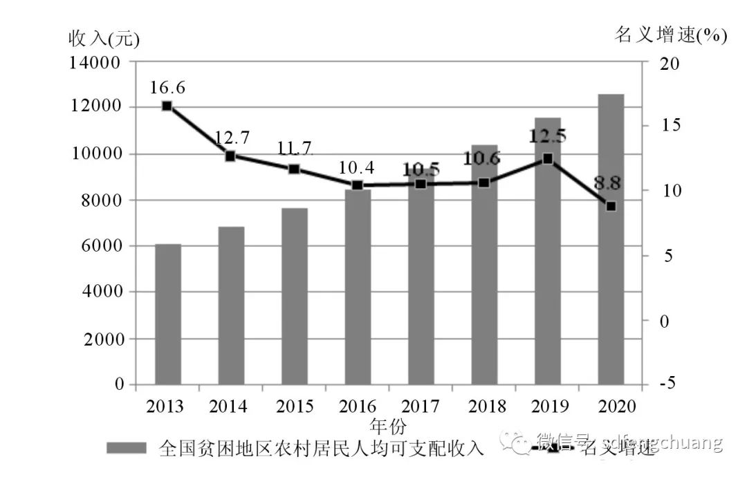 扶貧開發工作不是單方面的“輸血”,我國扶貧工作從慈善救濟到開發、綜合開發,再到精準扶貧,從捐物資、發資金、送種子到建學校、教技術,再到發展特色產業,各級政府在選擇產業項目時,考慮標準逐漸從“短期利高”過渡到“長期利好”,注重短期效應與長期發展結合,體現了我國扶貧從“輸血”到“造血”、以“輸血”來“造血”的決心。從脫貧攻堅到鄉村振興,區別于以往物質扶貧的方式,政府更注重特色產業對鄉村發展的作用,農村實現持續造血的關鍵在于提升農村群眾的內生動力與活力。發展特色產業是轉變群眾思想觀念,提升其內生動力的最有效方式,產業特色化、差異化是未來鄉村產業發展的趨勢。截至2020年底,全國832個已摘帽貧困縣組建各類產業扶貧技術專家組4 100余個,招募特聘農技員4 000余人。在政策支持與專家指導下,不斷建立適宜各地農村發展的食用菌、煙草、中藥材、茶葉、花卉等特色產業基地,農業功能持續擴展,從單一化種植到與旅游、文化、生態、互聯網等產業深度融合,實現擴大再生產,變“被動扶貧輸血”為“主動振興造血”。原國務院扶貧辦數據顯示,2019年全國參與特色產業發展的貧困戶占比超92%,得到產業扶持的貧困戶占比達72%,2020年產業幫扶政策貧困戶覆蓋比為98.9%,特色產業發展為農村持續造血提供了源源不竭的動力。農民收入來源從傳統種養收入擴展到工資、租金、保底分紅及資產收益分紅等。2013年到2020年僅8年時間,貧困地區農村居民人均可支配收入從6 079元增加到12 588元,年增長率約11.6%,提前實現比2010年收入翻一番目標(見圖1)。