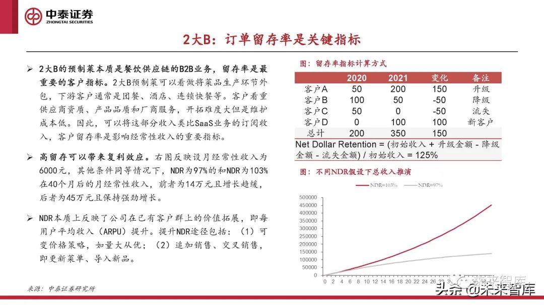 2大B的預制菜本質是餐飲供應鏈的B2B業務,留存率是最 重要的客戶指標。2大B預制菜可以看做將菜品生產環節外 包,下游客戶通常是團餐、酒店、連鎖快餐等。客戶看重 供應商資質、產品品質和廠商服務,開拓難度大但是維護 成本低。因此,可以將這部分收入類比SaaS業務的訂閱收 入,客戶留存率是影響經常性收入的重要指標。