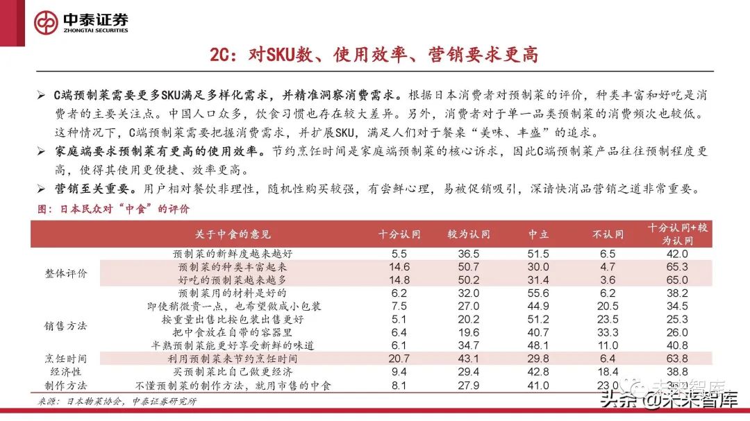 C端預制菜需要更多SKU滿足多樣化需求,并精準洞察消費需求。根據日本消費者對預制菜的評價,種類豐富和好吃是消 費者的主要關注點。中國人口眾多,飲食習慣也存在較大差異。另外,消費者對于單一品類預制菜的消費頻次也較低。這種情況下,C端預制菜需要把握消費需求,并擴展SKU,滿足人們對于餐桌“美味、豐盛”的追求。