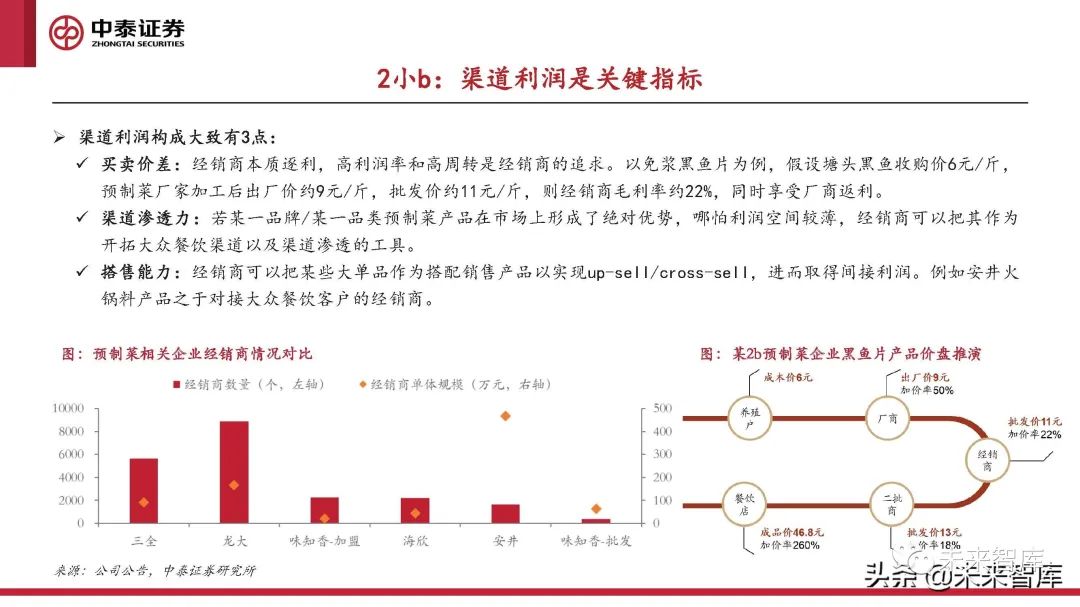 預制菜的2B、2b、2C渠道客戶訴求各異,渠道管理較為復雜。對于C端而言,消費者仍對預制菜的品質存在不信任, 同時易被概念營銷、促銷吸引。因此C端需要洞察消費心理,以線下曝光增強消費者教育,以營銷手段打造消費者心 智。對于大B端而言,性價比、產品品質、服務甚至客情都會成為影響采購決策的要素,因此渠道開發需要厚積薄發。對于小b而言,直接對接小b難度較大,大規模的批零終端保證了大眾餐飲中預制菜的觸及力。