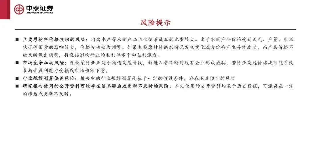 綜合體驗:產品易用性、口味還原度等,預制菜 企業需要持續研發迭代,輔以終端指導和服務以 滿足客戶需求,能有效融合技術、服務等多種優 勢的產品,才具備更高壁壘。