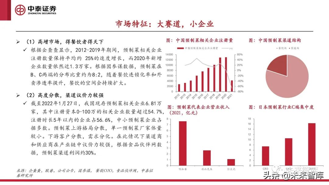 截至2022年1月27日,我國現存預制菜相關企業6.81萬 家,其中注冊資本0-100萬的相關企業數量超過54.7%, 注冊時長5年以內的企業占56.6%,中小預制菜企業占 據多數。預制菜上游格局分散,單一預制菜廠家體量 較小。下游客戶分散,需求分化。在此情況下渠道商 和供應商在產業鏈中議價力較強,根據食品伙伴網數 據,預制菜渠道利潤約30%。