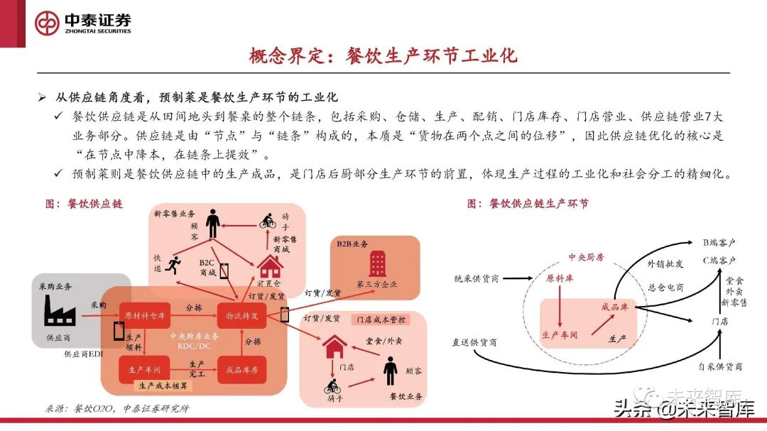 預制菜則是餐飲供應鏈中的生產成品,是門店后廚部分生產環節的前置,體現生產過程的工業化和社會分工的精細化。
