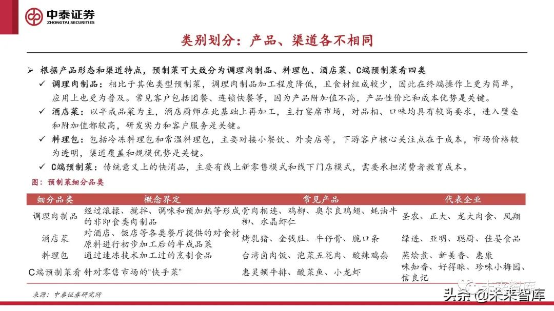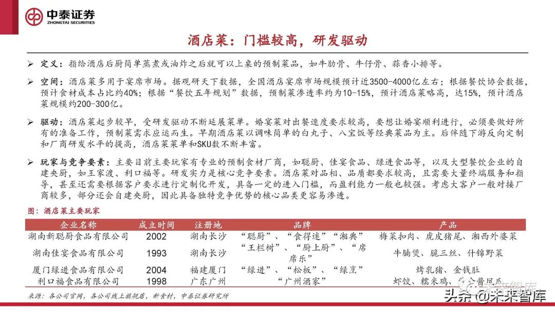 酒店菜:以半成品菜為主,酒店廚師在此基礎上再加工,主打宴席市場,對品相、口味均具有較高要求,進入壁壘 和附加值都較高,研發實力和客戶服務是關鍵。