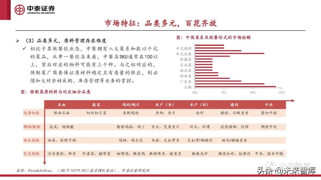 相比于其他餐飲業態,中餐擁有八大菜系和數以千記 的菜品,從單一餐飲店來看,中餐店SKU通常在100以 上,背后對應的物料可能有上千種。與之相對應的, 預制菜廠商要保證原材料穩定且有質量的供應,則必 須加大對食材采購、庫存管理等業務的掌控。