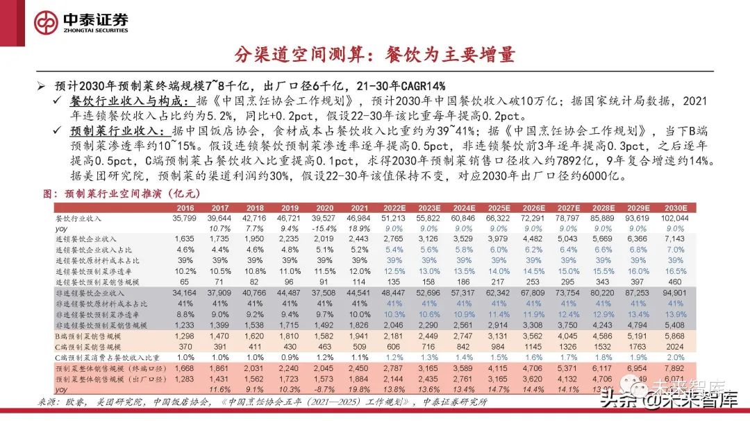 預制菜行業收入:據中國飯店協會,食材成本占餐飲收入比重約為39~41%;據《中國烹飪協會工作規劃》,當下B端 預制菜滲透率約10~15%。假設連鎖餐飲預制菜滲透率逐年提高0.5pct,非連鎖餐飲前3年逐年提高0.3pct,之后逐年 提高0.5pct,C端預制菜占餐飲收入比重提高0.1pct,求得2030年預制菜銷售口徑收入約7892億,9年復合增速約14%。據美團研究院,預制菜的渠道利潤約30%,假設22-30年該值保持不變,對應2030年出廠口徑約6000億。