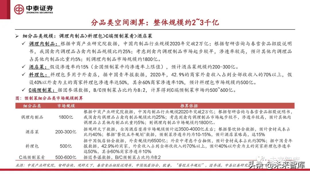 空間:根據中商產業研究院數據,中國肉制品行業規模 2020年突破2萬億;根據智研咨詢數據,禽肉制品占肉制 品份額約20%,則禽肉制品市場規模約4000億;據春雪食 品招股說明書,我國禽肉調理品市場規模超1000億,占禽 肉制品規模比約25%;考慮到禽肉調理制品市場起步較早, 滲透率較高,預計其他肉調理品占其他肉制品比重約5%;則調理肉制品市場規模約1800億。