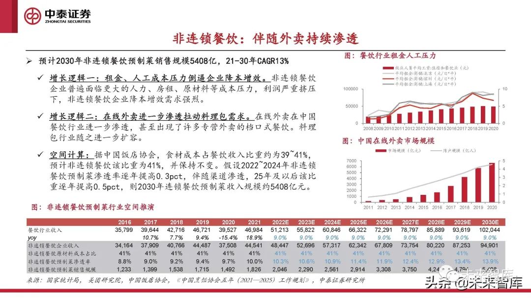 空間計算:據中國飯店協會,食材成本占餐飲收入比重約為39~41%, 預計非連鎖餐飲該比重為41%,并保持不變。假設2022~2024年非連鎖 餐飲預制菜滲透率逐年提高0.3pct,伴隨渠道滲透,25年及以后該比 重逐年提高0.5pct,則2030年連鎖餐飲預制菜收入規模約5408億元。(報告來源:未來智庫)