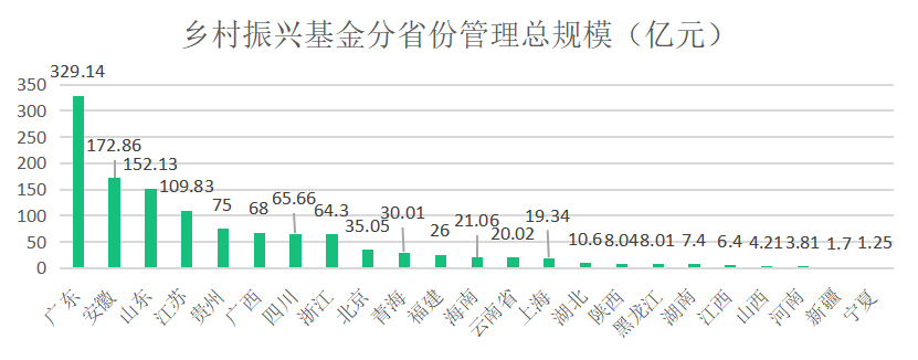 按照省份統計,有23個省份設立了鄉村振興基金。除央企農村投資基金外,設立鄉村振興基金規模前五名的省份分別是廣東、安徽、山東、江蘇、貴州其中,安徽、山東、江西的鄉村振興基金總管理規模已超過百億,廣東的鄉村振興基金總管理規模更是已經超過了300億。