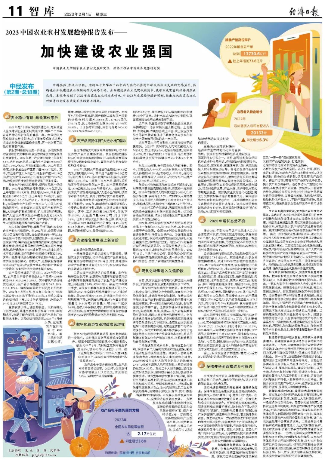 報告于2月1日由《經濟日報》“智庫”版整版推出,這是國家農業農村發展研究院和經濟日報社中國經濟趨勢研究院聯合完成的又一項重要成果。近三年,雙方聯合推出的系列報告被《新華文摘》等多家權威媒體全文轉載,社會反響強烈。