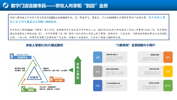 第二個平臺就是農(nóng)牧人商城。再到城市端毛細(xì)血管是農(nóng)牧人在做的事情,農(nóng)牧人在農(nóng)批市場下游就是農(nóng)貿(mào)市場,一是社區(qū)里打造了數(shù)字門店體系,它是一套SaaS化的系統(tǒng),能夠讓農(nóng)貿(mào)市場檔口直接接入進來,我們合作之后一是幫助它形成數(shù)字化門店管理;二是做了終端、末端,就是社區(qū)里集單體系。農(nóng)貿(mào)市場里每天銷售由我們進行集采批發(fā),給他配送到店。