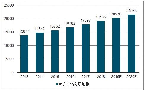 數據顯示,國內消費者對生鮮商品鮮都要求較高,生鮮需求頻率較高,平均每周購買 3 次,高于全球平均值2.5次,水果蔬菜每周購買頻次高達 4.8次。高頻、旺盛需求帶動下,國內生鮮市場規模自 2013 年以來保持 6%以上增速,2020年或將達2.16萬億。