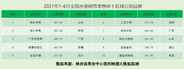 2021年1-6月全國水果區域公用品牌累計網絡零售額547.65億元,在水果農產品網絡零售額占比69.91%。“煙臺蘋果”“洛川蘋果”穩居前兩位。
