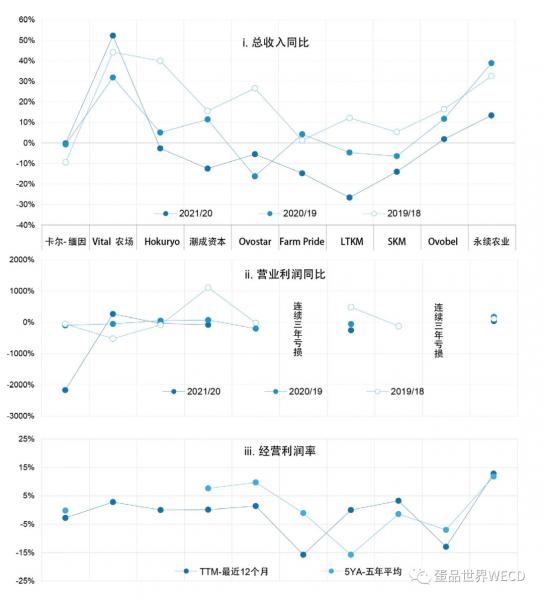 新冠疫情大流行以來,全球蛋雞生產上市企業前十強中,多數企業在2021/20年度總收入同比出現負增長,較疫情前的2019年和2018年均出現明顯下降;營業利潤、經營利潤率也出現類似特征但較營收下降幅度不太明顯,連續3年虧損的Farm Pride食品公司、Ovobel 食品公司同期虧損幅度進一步加大;比較來看,另外10家上市企業2021/20年度的總收入、營業利潤、經營利潤率波動幅度整體不太明顯。