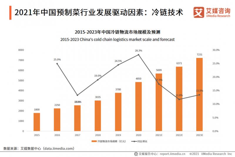 冷鏈物流技術驅動預制菜市場發展,2021年中國冷鏈物流市場規模將達5699億元,同比增長17.5%,冷鏈物流整體市場規模增長較快。艾媒分析師認為,冷鏈物流保障了預制菜品的新鮮度和提升了銷售半徑,中國冷鏈物流市場規模不斷擴大,有助于預制菜行業業務拓展和擴充。