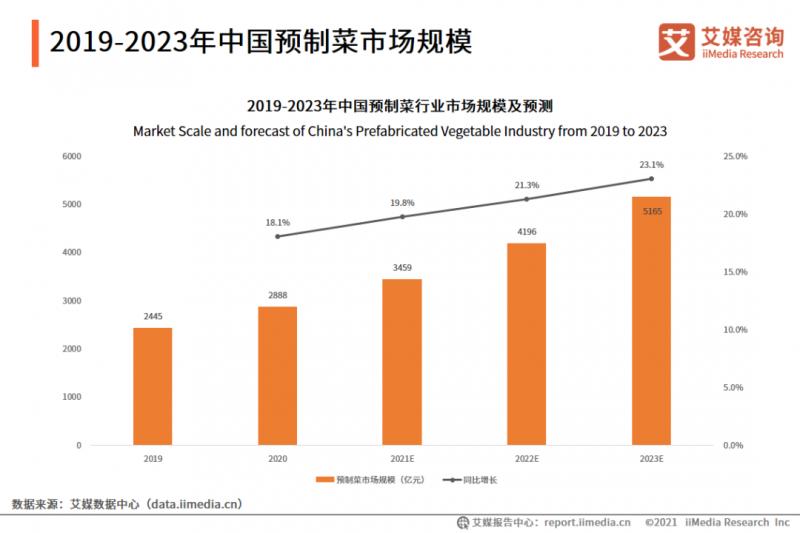 iiMedia Research(艾媒咨詢)數據顯示,2019年中國預制菜市場規模約2445億元,B端市場為1956億元,C端市場489億。2021年中國預制菜行業規模預估為3459億元,同比增長18.1%,預計未來中國預制菜市場保持20%左右的增長率高速增長,2023年預制菜市場規模將達5165億。