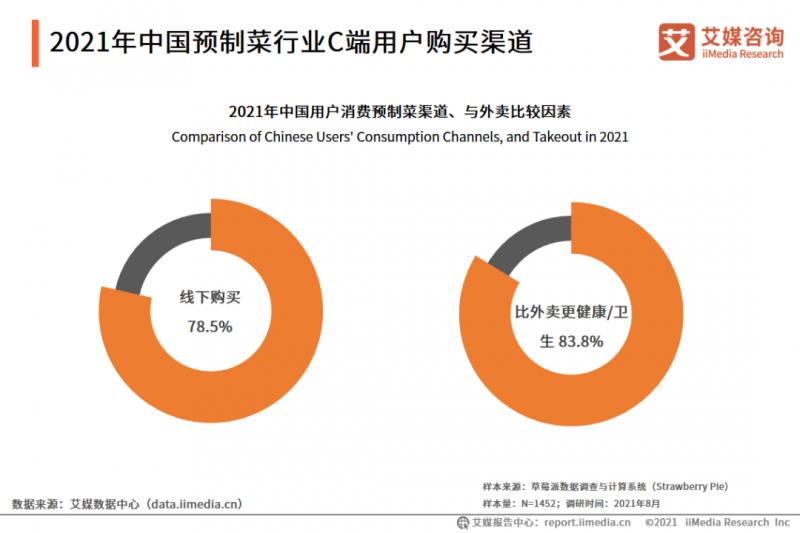 調研數據顯示,用戶主要通過線下渠道購買預制菜品,與外賣相比83.8%的用戶覺得預制菜品更健康、衛生。艾媒分析師認為,大眾普遍認為預制菜比外賣更健康,預制菜在C端顧客市場潛力較大。