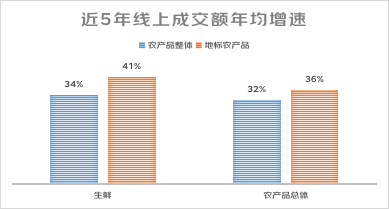 地標農產品是農產品上行的新增長點。近5年,地標農產品消費金額年均增長36%,高于農產品整體增速4個百分點;地標生鮮農產品消費金額年均增長41%,高于生鮮農產品整體增速7個百分點。