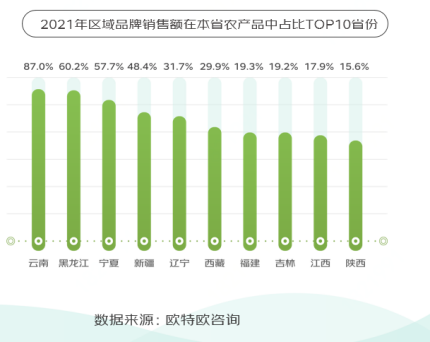 2021年,云南產的地標農產品銷售額在本省農產品總銷售額中占比87%,是地標農產品上行能力最強的省份。黑龍江、寧夏、新疆、遼寧產的地標農產品銷售額在本省農產品總銷售額中占比分別為60%、58%、48%、32%。