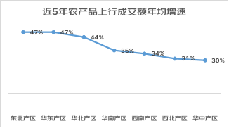 華北、華東產區的生鮮產品近5年成交額增長最快,增速都超過了50%;東北、華南產區的糧油調味品近5年成交額增長較快,年均增速為52%、47%。