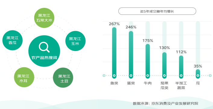 黑龍江五常大米、玉米、木耳成熱搜詞,地標糧油商品成為黑龍江的一張特色名牌。東北大米、東北黑木耳、黑龍江黃豆是最暢銷的地標農產品。從增長角度看,黑龍江魚類、蛋類銷售年均增速超2倍,牛肉、茄果瓜類年均增長超100%。