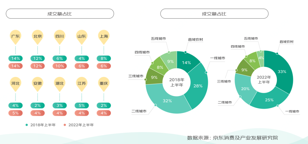廣東買了最多的黑龍江農產品,北京、四川購買黑龍江農產品的消費占比也超過了10%。縣域農村購買黑龍江農產品的消費占比從2018上半年的14%,提升到2022上半年的33%。