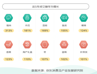 從細分品類來看,地標豬肉商品近5年成交額年均增長313%。水果品類中,