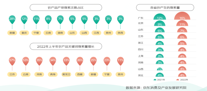 地標農產品認知度提升,新疆是搜索量最高的農產品產地,其次是重慶、寧夏、云南、湖南。