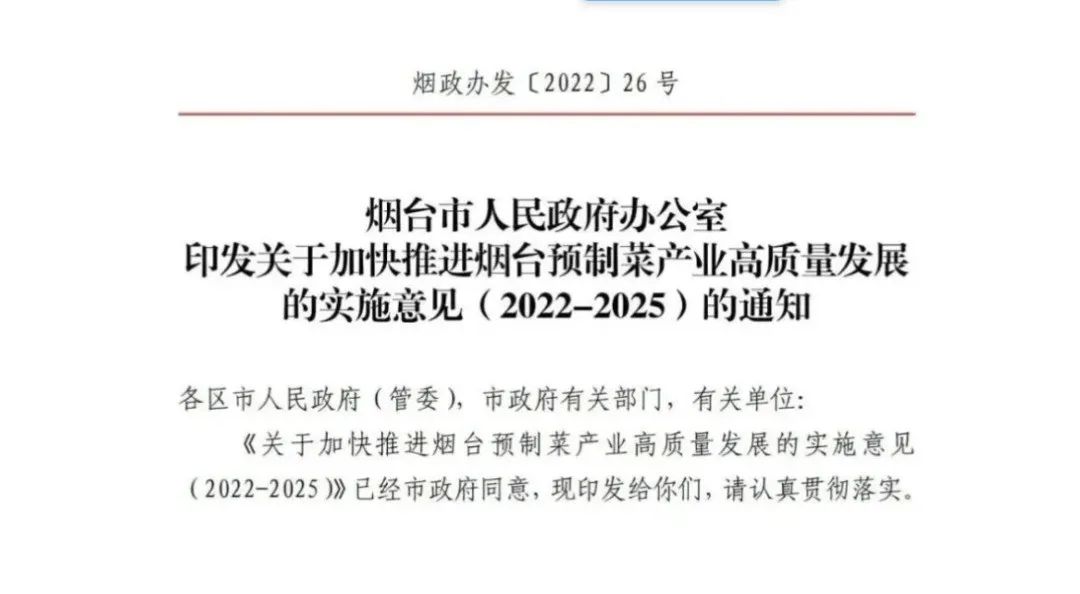 2022年11月,煙臺市人民政府辦公室印發了《關于加快推進煙臺預制菜產業高質量發展的實施意見(2022-2025)》(下文簡稱《意見》)。