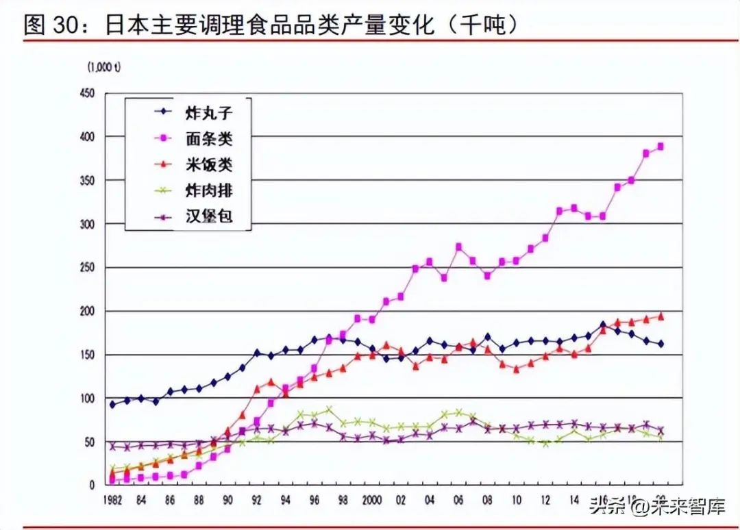 冷凍調(diào)理食品占比約 90%,主食類產(chǎn)品增加為重要驅(qū)動因素。日本冷凍食品行業(yè)的持 續(xù)增長主要緣于加工程度較高的冷凍調(diào)理食品需求持續(xù)提升。根據(jù)日本冷凍食品協(xié)會,冷 凍調(diào)理食品產(chǎn)量占國內(nèi)冷凍食品總產(chǎn)量比例從 1970 年 45%提升至 2021 年 90%;2021年冷凍調(diào)理食品產(chǎn)值占比為 86%(其中油炸類占比 23%,非油炸類占比 63%)。分階段看, 1997 年之前為油炸類調(diào)理食品和非油炸類調(diào)理食品共同驅(qū)動冷凍食品行業(yè)成長,1997 年 后,隨著餐飲端需求萎靡、家庭端便捷烹飪需求增加,可用微波爐加熱即食的面條、米飯 等家庭端主食類產(chǎn)品銷量保持快速增長,非油炸類調(diào)理食品成為行業(yè)主要成長驅(qū)動因素。