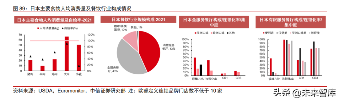 上游進口依賴度高,龍頭以水產(chǎn)類企業(yè)為主,下游便利店占據(jù)較高份額。上游方面, 日本肉類消費量從高到低依次為雞肉、豬肉、牛肉,谷物以大米為主。除大米外的食物自 給率較低,依賴進口,國內(nèi)禽畜類養(yǎng)殖以農(nóng)戶為主,沒有規(guī)模較大的養(yǎng)殖類上市企業(yè),第 一產(chǎn)業(yè)龍頭以日本水產(chǎn)、丸羽日朗、日冷等漁業(yè)企業(yè)和遠(yuǎn)洋捕撈企業(yè)為主。下游餐飲方面,日本全服務(wù)餐廳和有限服務(wù)餐廳各占 43%,其中全服務(wù)餐廳主要以各 類料理店、壽司店為主,連鎖化率高但集中度較低;有限服務(wù)類餐廳中便利店占比達到 48%, 并且高度集中,7-11、羅森、全家合計份額達到 75%,其次為麥當(dāng)勞代表的漢堡類餐廳。